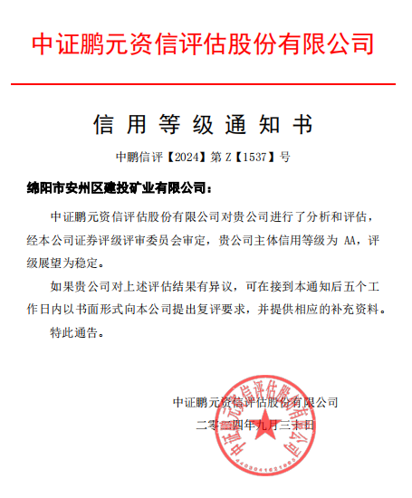 信用評級是企業(yè)在資本市場上的“身份證”,也是企業(yè)綜合實力和信譽的重要體現(xiàn)。近年來,在安州區(qū)委、區(qū)政府、區(qū)國資辦的帶領(lǐng)下,建投礦業(yè)規(guī)模效益穩(wěn)步提升、業(yè)務(wù)領(lǐng)域不斷拓展、改革不斷深化、監(jiān)管體系不斷完善,較好完成各項目標(biāo)任務(wù)。此次獲評不僅是對建投礦業(yè)管理水平、資產(chǎn)結(jié)構(gòu)、經(jīng)營效益等工作的高度認(rèn)可,也是對安州區(qū)推動國有企業(yè)改革工作的充分肯定。